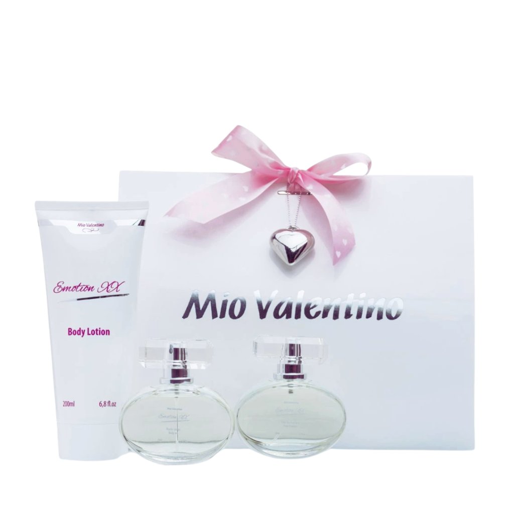 Prebuďte svoje zmysly a objavte krásu, ktorá pramení z hlbín vášho vnútra a zdravej, dobre ošetrovanej pokožky. S naším exkluzívnym setom Emotion XX Valentine´s Love Ritual zažijete lásku a starostlivosť v každom okamihu. Tento limitovaný darčekový set zabalený do elegantnej krabičky, zdobenej srdiečkom, mašľou a strieborným logom Mio Valentino je synonymom pre rafinovanosť a romantiku. Či už ho darujete sebe alebo svojej milovanej, Emotion XX Valentine´s Love Ritual je dokonalou voľbou pre momenty, keď chcete osláviť lásku – nielen na Valentína. Vychutnajte si účinky Emotion XX spevňujúceho telového mlieka s arganovým olejom, ktoré dokonale vyhladzuje a hydratuje pokožku, zatiaľ čo parfumovaný telový olej obnovuje jej mladistvý vzhľad a dodáva zamatovú hebkosť. A keď pridáte na záver Eau de Parfum Pour Femme, zahalíte sa do nádherných kvetinovo-ovocných tónov, ktoré zdôraznia vašu ženskosť a pridajú vám sebavedomie.